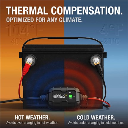 The GENIUS2D now features an integrated thermal sensor that automatically monitors and adjusts the charging cycle based on fluctuations of ambient temperature, enabling it to provide more precision charging in both hot and cold climates. Not only does it increase charge performance, but it extends battery life by limiting the impact of under-charging/over-charging caused by temperature changes. So now when you are charging in cold temperatures, the charging rates increase, and when in hotter temperatures, the rates will decrease. The result, better, more accurate, fully-charged batteries.