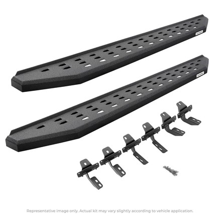 The legendary RB Series of cab length running boards from Go Rhino will make your truck, Jeep or SUV stand apart from the crowd. These, aggressive, stylish bolt-on side steps take their visual inspiration from the Ford Raptor but are made for more than just looks. The RB20 running boards have perforated holes punched into the surface of the step, which gives maximum traction and prevents mud, ice, and snow from accumulating. The corrosion-resistant 16-gauge zinc coated steel steps are mounted high and tight, giving them plenty of clearance for off-road adventures, and are strong enough to support hundreds of pounds. The RB20 is offered in textured black powder coat or rugged, bedliner coating. Hardware and brackets are included and installation on most vehicles will not require drilling. RB20 Running Boards come with a Limited Lifetime warranty on materials and construction and a 5 year warranty on the the Textured Black and Bedliner Finish.