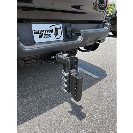 This solid steel adapter allows you to attach a weight distribution system to a BulletProof Hitch. After modifying your vehicle's suspension and/or adding larger tires, you may need a hitch with a longer drop. This accessory is compatible with all BulletProof Hitches and MOST weight distribution systems. The adapter is 2" wide and the holes are 3/4" in diameter and spaced 1-1/4" on center.