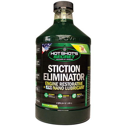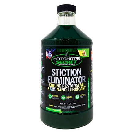 Hot Shot's Secret Stiction Eliminator is an engine oil treatment and oil stabilizer engineered to remove the sludge and varnish created from burnt oil from inside your engine while also lubricating to protect engine components. Stiction is the term for the sticky friction caused by the deposits that form inside your engine over time. This stiction results in lost power and compression, lower fuel economy and leads to excessive wear inside the engine. Stiction Eliminator is a unique blend of synthetic cleaner and a proprietary carbon nano lubricant that removes harmful stiction and lubricates components inside your engine, including turbocharger, rings, oil pump, pistons, HEUI injectors and more. It is scientifically proven to remove stiction in 100% of engines, reduce engine wear up to 62%, improve power and compression, and increase fuel economy. Stiction Eliminator is a unique blend of synthetic cleaner and a proprietary carbon nano lubricant that cleans stiction while reducing the coefficient of friction. Use in any gasoline or diesel engine to increase fuel economy, reduce wear and dissolve power robbing stiction (sludge). It is perfect as a diesel additive in diesel oil, or gasoline additive for regular engine oil. Use approximately 4 fl oz per quart of oil for initial cleanup, 2 fl oz per quart of oil for maintenance. Add STICTION ELIMINATOR during a fresh oil change and leave in dur TREATMENT ing entire oil change interval. Product will displace an equal amount of oil, do not overfill.