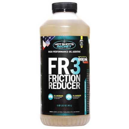 FR3 Friction Reducer is a 100% synthetic engine additive that enhances the host oil's wear reduction and lubricating properties. Hot Shot's Secret FR3 contants three patented synthetic lubricants that have unique lubricating properties even compared to PAO or mPAO synthetics of the same viscosity. The anti-wear component of the formula is a patented carbon nano particle that fills in microscopic irregularities on the machined surface to provide a smoother surface for the lubricating film to form. The synergy of these components extend the base oil performance in shear stability, oxidation stability, film strength & especially friction reduction.An exclusive carbon nano lubricant, fills in microscopic irregularities in the metal surfaces. FR3 is recommended for all diesel and gas engines, works with synthetic or conventional oils. Add it to a hydraulic system, power steering, engine oil or differentials. Use FR3 Friction Reducer oil in autos, farm and heavy-duty equipment, pickup truck and semi-truck engines. FR3 Friction Reducer works for any oil-lubricated system. Although FR3 is an industrial product, small two-cycle engines can benefit from it as well. Mix FR3 with fuel after adding it to your two-cycle oil. Use approximately 1.5 OZ (45 mL) per quart (.95 L) of oil. Add FR3 FRICTION REDUCER during a fresh oil change and leave in during entire oil change interval. Use in the next two oil changes after STICTION ELIMINATOR . Product will displace an equal amount of oil, do not overfill. Safe to add to engine oil, power steering, hydraulic system, and differentials.