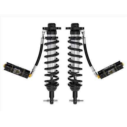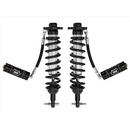 The ICON Vehicle Dynamics V.S. Series 2.5� remote reservoir coilover shocks are an incredible upgrade for the front end of the 2021-2023 Ford F150. ICON's Vehicle-specific valving provides a sport tuned feel on and off-road while offering of lift height adjustability for use of larger, more aggressive wheel and tire combinations. The larger 2.5� shock body and increased piston area over stock components provides improved damping ability and outstanding ride characteristics across varying types of terrain. Remote reservoirs ensure optimum performance by increasing the duration of consistent damping regardless of situation, keeping the shocks at a cooler operating temperature during heavy use. When paired with ICON rear 2.0 Aluminum Series or 2.5 Aluminum Series shocks, vehicle control will be balanced front to rear resulting in the best overall driving experience for your F150.
