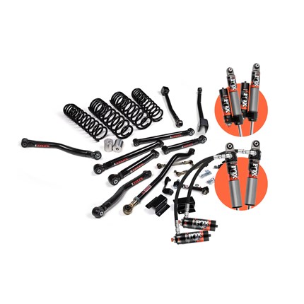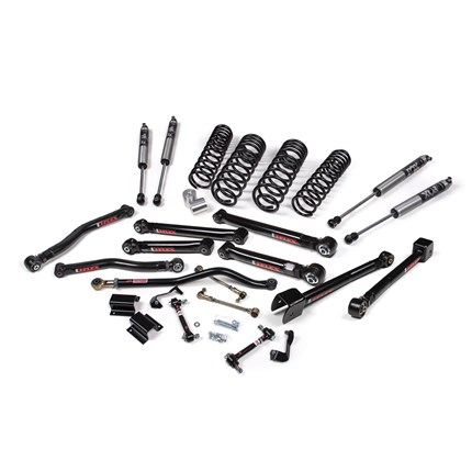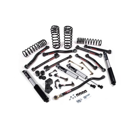 From hardcore rock crawling to high-speed desert, the J-Krawl System brings a level of performance and adjustability that makes it the go to package for many Jeep enthusiasts. These systems build on the base systems and add comments for a full overhaul of the factory suspension to maximum articulation, strength and allow for adjustability. Components include J-Flex upper and lower control arms, Jspec dual rate coil springs, an adjustable front track bar, a rear track bar bracket, quicker disconnect front sway bar end links, and bump stop extensions.