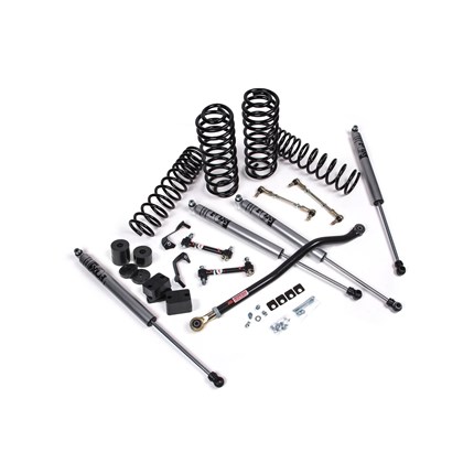 Increase your Jeep Wrangler JL ground clearance, tire clearance and overall capability with a J-Venture System. This complete, bolt-on system includes matched Jspec dual-rate coil springs, custom-valved FOX gas shocks, front adjustable track bar, rear track bar bracket, front sway bar Quicker disconnects, bump stop extensions, and caster plate alignment correction.
