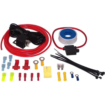 Kleinn 12v or 24V Compressor Wiring Kit includes all the wires, connectors and other parts you need to install a Kleinn air horn system. The Wiring kit includes a 5-pin relay, fuse & fuse holder, wire for the compressor and horn, Kleinn Air Horn Juice to seal air fittings and a variety of wire crimps and connectors. Also included with the Wiring Kit is a color coded wiring diagram for the compressor hook up for your convenience.