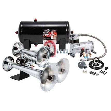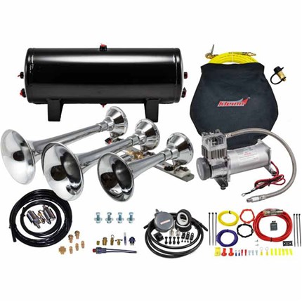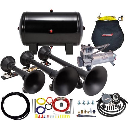 Give your vehicle the same tone as a train with the Kleinn HK5 Black Dual Train Horn Kit. The Train Horn Kit includes Dual Black ABS trumpets 15.5? and 10.5? that are incredibly durable and have an extreme sound that will blow people away.