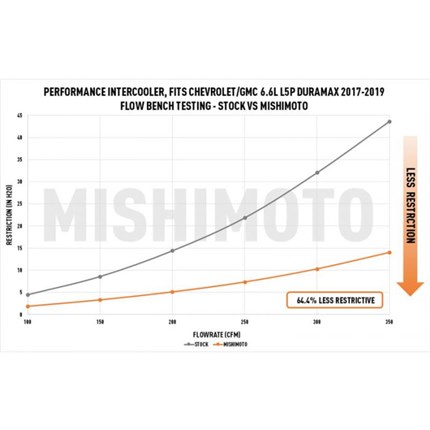Mishimoto has expanded our line of Duramax performance parts to include a performance intercooler for the 2017-2019 Chevrolet/GMC 6.6L Duramax L5P. High intake temperatures can reduce performance and potentially cause engine damage if left unchecked. Protect your investment by upgrading to the Mishimoto 6.6L Duramax L5P performance intercooler. This Duramax intercooler is precision engineered with durable cast-aluminum end tanks that resist cracking under high temperatures and boost pressures. The massive 68mm-thick bar-and-plate core is 70% thicker than stock and is designed for maximum cooling. In addition, the larger core reduces restriction by over 64% compared to the stock intercooler. We've also increased the size of the intercooler inlet and outlet by 6mm and 12mm, respectively, to improve flow even more. Included with this intercooler is an adapter cold-side pipe with DuraCore boot and constant-tension T-bolt clamps. Two additional bungs on the adapter pipe can be drilled and tapped for sensors or water/meth injection. Offered in Sleek Silver or Stealth Black powder-coated finish, the Mishimoto 6.6L Duramax intercooler, like all our Duramax performance parts, is protected by our signature Mishimoto Lifetime Warranty.