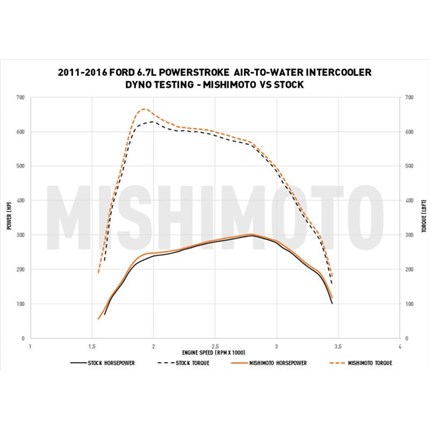 Aside from being more durable than stock, the Mishimoto 6.7L Powerstroke intercooler also flows better. Flow bench testing showed that the Mishimoto intercooler flowed 22% better than the stock cooler. On the dyno, that extra flow allowed our stock 6.7L Powerstroke to make 40 lb-ft more torque.