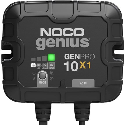 Meet the all-new GENPRO10X1. Similar to our GEN1, only better. It's 41% smaller and delivers 33% more power. It's one of the best performing onboard marine battery chargers we have ever made. A one-bank onboard battery charger rated at 10-amps (10-amps per bank) for 12-volt batteries, including marine, boat, starter, and deep-cycle batteries. Independently charge and control each battery bank with selectable charging modes - including 12V, 12V AGM, 12V Lithium, and 12V Repair Mode - for all types of lead-acid and lithium-ion batteries.