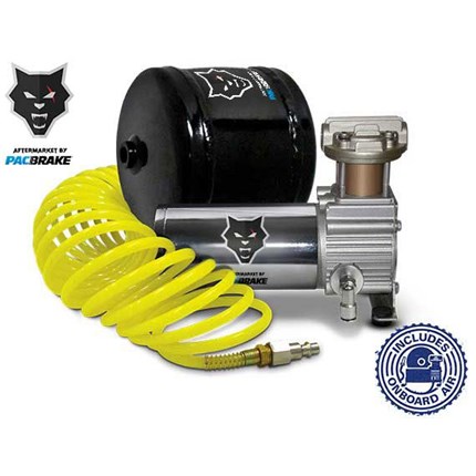 PRXB Exhaust Brake, Controller (when required for application) and Pacbrake Onboard Air Kit, which includes: HP325 Series Compressor, 0.5 Gal Air Tank, 25 Foot Coiled Air Hose, Air Accessories and Fittings Kit.