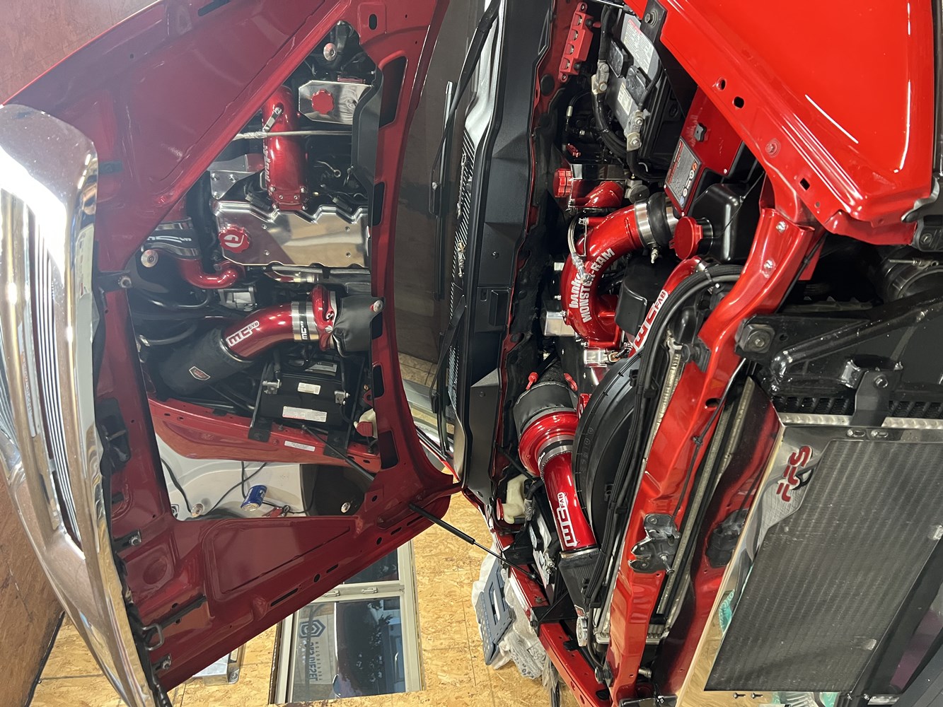 Banks cold air intake, monster ram air horn, heater grid delete.