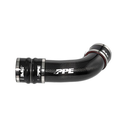 The PPE Zilla Carbon Fiber Turbo Inlet Tube replaces the restrictive, plastic intake tube and resonator that comes stock on your truck. The kit includes the PPE Zilla Carbon Fiber Turbo Inlet Tube, two Heavy-Duty 6mm 5ply Black Silicone Couplers, and stainless steel coupler clamps.