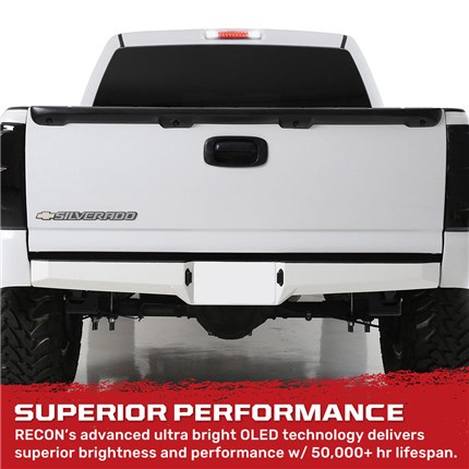 Designed for the 1999-2006 GMC Sierra & Chevy Silverado 1500/2500/3500. This red LED clear lens third brake light kit from RECON comes complete with white LED cargo lights. It's the perfect GMC or Chevy truck upgrade. As one of our most popular third brake light upgrades we know this product is just what every GMC or Chevy truck owner needs, too. It's the best clear lens third brake light there is.