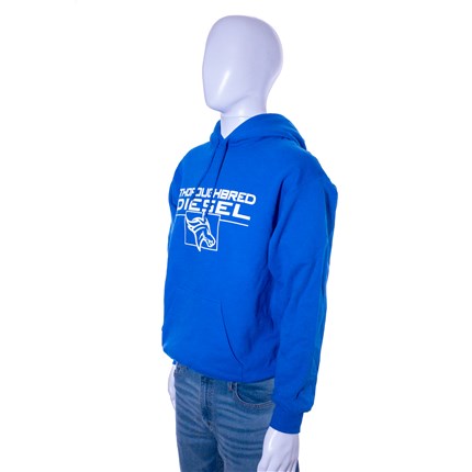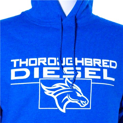 Our Classic Thoroughbred Diesel Blue Pullover Hoodie is back and better than ever! Show off your love for Thoroughbred Diesel with the return of one of our most iconic logos. Featuring a bold white square design with two extending lines, this logo combines the timeless Thoroughbred Diesel Horse emblem with classic branding.