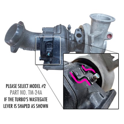 To ensure the correct Turbo-Master is selected for your application, please confirm your turbocharger's wastegate design using the pictures below. Many customers have turbochargers installed on their trucks that may be different from the model that typically came with the truck from the factory. The year model truck you have does not always correspond with a specific turbocharger model.