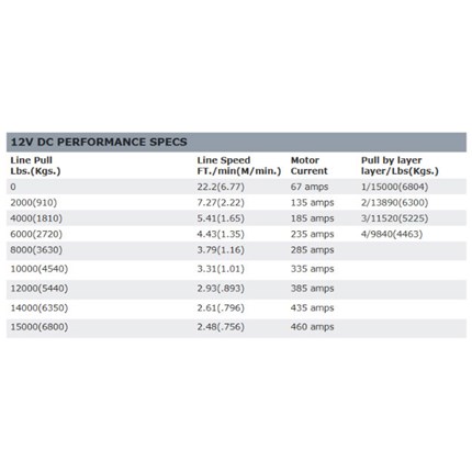 The M15000 Series 12 volt electric winch is vehicle mounted and has a pull capacity of 15,000 pound. It has a 90' of 7/16" wire rope.