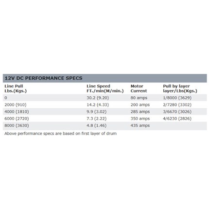 The M8000 Series 12 volt electric winch has a pull capacity of 8,000 pounds and comes with 100’ of 3/8” Spydura synthetic rope and polished aluminum hawse fairlead.