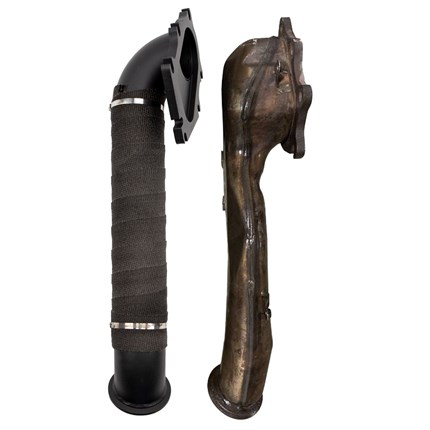 Replace the restrictive crushed factory down pipe on your L5P Duramax with this 3.5" Down Pipe for improved exhaust flow. Connects to the DOC outlet flange behind the OEM turbo and mates with OEM exhaust system front pipe with the 4 bolt style flange connection. Black Ceramic Coated and Heat wrapped. Down Pipe includes bungs for sensors and NO tuning required to use this down pipe. WCFab piping kits and emissions compliant tuning recommended for optimum performance gains.