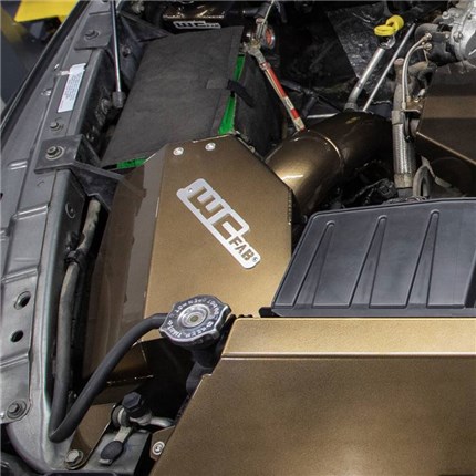 2010-2012 6.7L Cummins 4" Intake Kit with Air Box for OEM / VGT Turbocharger. This high flow, fabricated aluminum intake pipe and air box enclosure with dry filter assembly replaces the restrictive plastic factory parts on your diesel for improved engine performance. All new design significantly increases air flow to your turbo producing improved horsepower and torque, quicker throttle response, and cooler intake temperatures by drawing cold air through the inner fender. All aluminum construction features large diameter 4" piping with smooth aerodynamic bends to improve intake air velocity, volume, and provide more aggressive engine and turbo sound during acceleration. High quality hardware, silicone boot, seals, and stainless steel t-bolt clamps ensure optimum durability and ease of installation. Removable air box lid element allows for easy visual inspection and maintenance of your WCFab filter with included hydrophobic pre-filter cover, to help keep your MAF sensor, turbo, and engine airways contaminant free. Full assembly finished in your choice of WCFab's signature custom powder coat colors for a look as unique as your truck. Made in USA. Air box is NOT compatible with intake pipe from kit WCF100863.