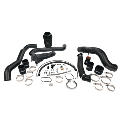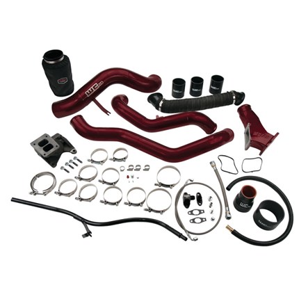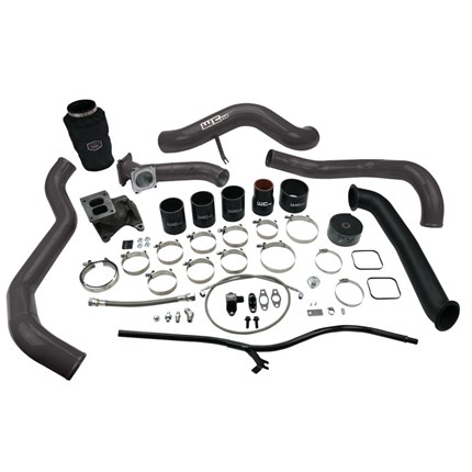 This kit will allow you to install an S300 based Turbo on your Duramax. Replacing all of the OEM plumbing and y-bridge with high flow 3" diameter piping. Oil Lines are high quality stainless steel braided Parker Lines with the oil feed line routing from the main oil galley on the side of the engine block. We designed our down pipe to connect with your exhaust system V-Band and clamp which simplifies installation and does not require you to cut your exhaust system. If you are not purchasing the turbo from us you must specify the brand of turbo you are using, some Turbo's you may be required to ship to use for mock up to build the kit. Each turbo kit is hand built in house by our experienced fabricators and welders. Every part is built and test fit on an engine to ensure proper fitment. Includes Driver Side Transmission Dipstick Tube which makes installation of the down pipe easier.