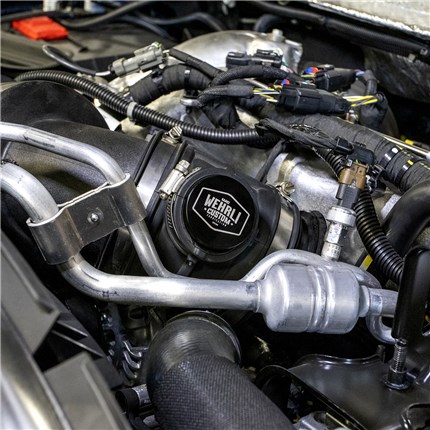 2017-2025 L5P Duramax Billet Black Anodized Turbo Resonator Plug, This quick and easy to install, billet aluminum plug allows you to clean up your engine bay and get more aggressive turbo sound in minutes by removing the big plastic resonator connected to your OEM intake. 100% warranty and emissions friendly. CNC machined in the USA from 6061 aluminum. Black anodized finish with engraved Wehrli Custom Fabrication logo.