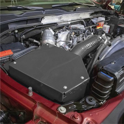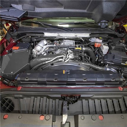 High flow, fabricated aluminum intake pipe and air box enclosure with dry filter assembly replaces the restrictive plastic factory parts on the L5P Duramax for improved engine performance. Increases air flow to turbo producing improved horsepower and torque, quicker throttle response, and cooler intake temperatures by drawing cold air through the hood Ram Air duct and inner fender. All aluminum construction features large diameter 4" piping with smooth aerodynamic bends to improve intake air velocity, volume, and provide more aggressive engine and turbo sound during acceleration. Full assembly finished in your choice of WCFab's signature custom powder coat colors for a look as unique as your truck.