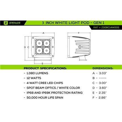 Product Name:ZROADZ Z30BC14W20S 3" Square LED Spot Light Pod Manufacturer: ZROAZ Manufacturer Part #:Z30BC14W20S Thoroughbred Diesel Part #:ZRZZ30BC14W20S